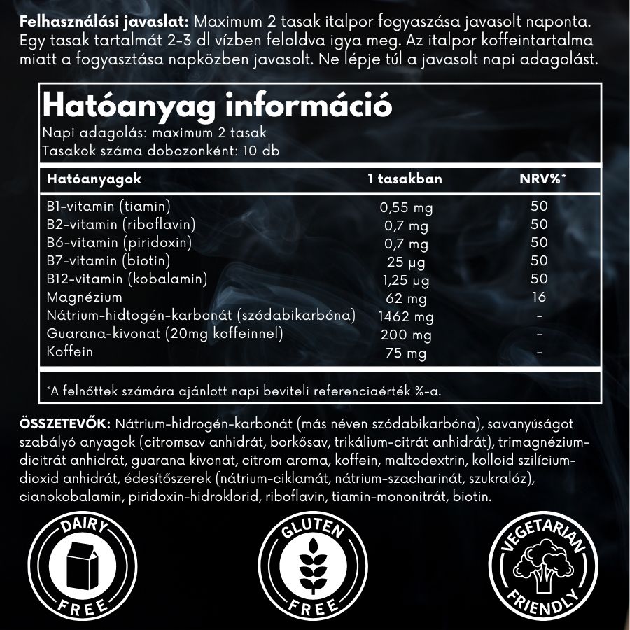 Nátrium-hidrogén-karbonát (más néven szódabikarbóna), savanyúságot szabályó anyagok (citromsav anhidrát, borkősav, trikálium-citrát anhidrát), trimagnézium-dicitrát anhidrát, guarana kivonat, citrom aroma, koffein, maltodextrin, kolloid szilícium-dioxid anhidrát, édesítőszerek (nátrium-ciklamát, nátrium-szacharinát, szukralóz), cianokobalamin, piridoxin-hidroklorid, riboflavin, tiamin-mononitrát, biotin.