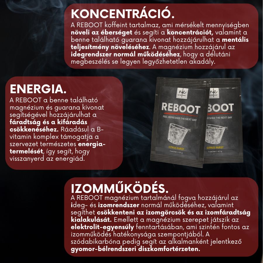 A REBOOT egy koffeint, B-komplexet, magnéziumot és szódabikarbónát tartalmazó italpor, ami segít csökkenteni a fáradtságot és a kimerültséget, így nem csak a mindennapi feladataid elvégzéséhez megfelelő társad, de a szellemi frissességed és koncentrációd fenntartásában is segít.